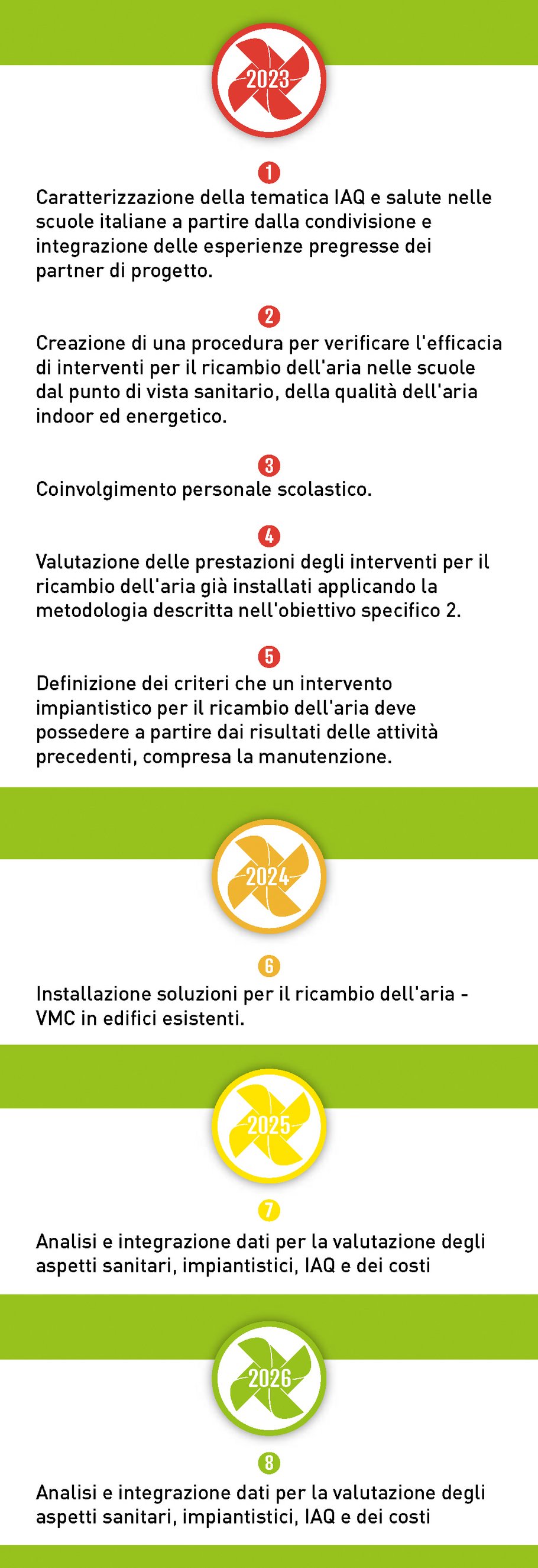 - Caratterizzazione della tematica IAQ (Indoor Air Quality) e salute nelle scuole italiane a partire dalla condivisione e integrazione delle esperienze pregresse dei partner di progetto;